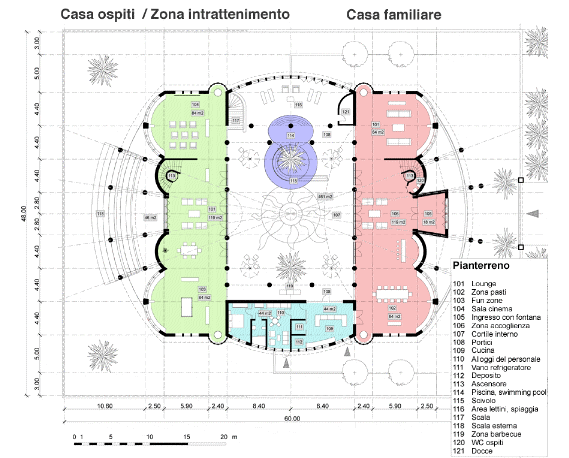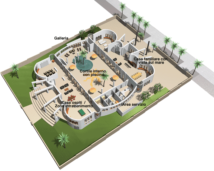 Il progetto CASA DEL SOL va visto come una struttura modulare: è possibile eliminarne interi blocchi, si può ad esempio rinunciare alla casa ospiti. Ma è ugualmente possibile scegliere per la casa familiare e per la casa ospiti delle posizioni diverse da quelle illustrate. La CASA DEL SOL esiste anche in versioni più piccole, a partire da 1.110 m2. Veda a questo proposito LE VERSIONI DELLA CASA DEL SOL (tutte le immagini ed i grafici presentano la CASA DEL SOL 2.500m2 in Luxury Quality).
