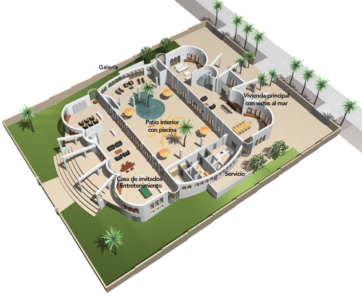 Considere el concepto CASA DEL SOL como un "juego de construcción": se pueden eliminar bloques individuales como, por ejemplo, la casa de huéspedes. También se puede cambiar la posición del domicilio familiar o de la casa de huéspedes. Elija la casa de sus sueños dentro de la serie CASA DEL SOL, de acuerdo con sus necesidades, a partir de 1.110m2. Para más detalles, haga clic en LAS VARIACIONES DE LA CASA DEL SOL. (Todas las imágenes y gráficos muestran CASA DEL SOL, modelo 2.500m2).